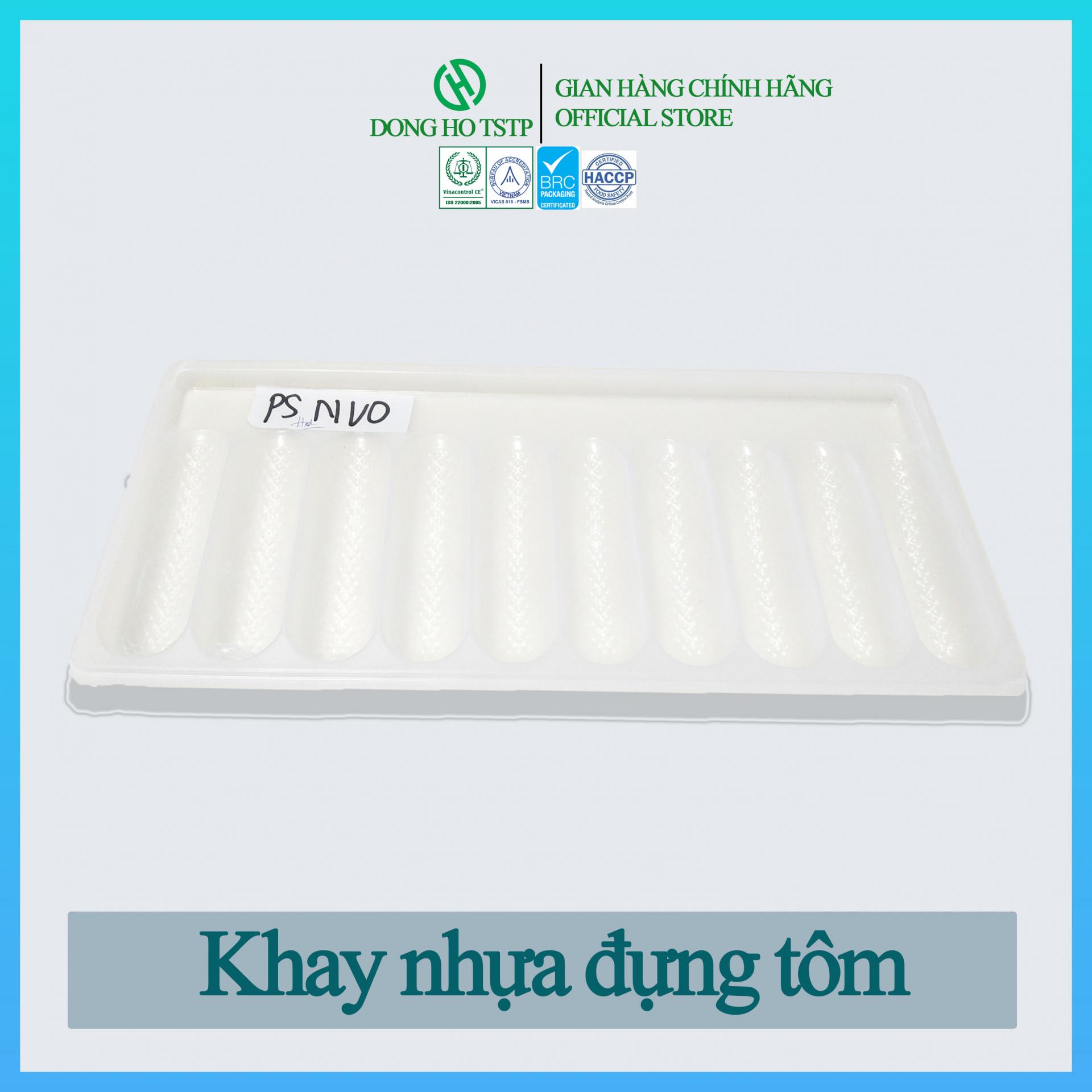 Đặc điểm sản phẩm: Khay nhựa PS đựng tôm được chia ra thành từng ngăn riêng biệt (thường 10 ngăn) với kích thước vừa đủ để đảm bảo sao cho giữ được hình dáng và chất lượng của tôm trong quá trình bảo quản tủ đông trong siêu thị hay vận chuyển trên cont để xuất khẩu đường thủy hay đường hàng không. Đặc biệt khay PS đựng tôm Dong Ho TSTP chuyên sử dụng để đựng tôm sú vì kích thước rộng rãi, chất liệu, màu sắc sang trọng của nó mang đến cho sản phẩm.
