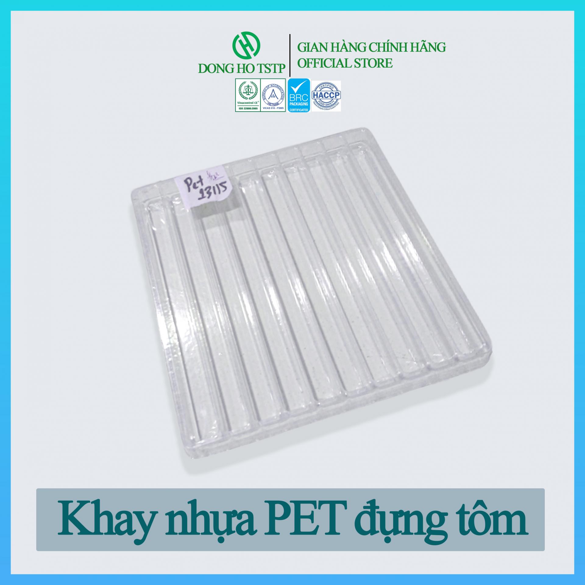 Đặc điểm sản phẩm: Khay nhựa PET đựng tôm được chia ra thành từng ngăn riêng biệt (thường 10 ngăn) với kích thước vừa đủ để đảm bảo sao cho giữ được hình dáng và chất lượng của tôm trong quá trình bảo quản tủ đông trong siêu thị hay vận chuyển trên các phương tiện để xuất khẩu đường thủy hay đường hàng không. Đặc biệt khay PET đựng tôm Dong Ho TSTP chuyên sử dụng để đựng tôm lạnh, xuất khẩu sống hay còn gọi là tôm Nobashi, chiều dài tôm được kéo ra bởi quá trình cắt bụng và ép,…vì vậy kích thước tôm sẽ thẳng và dài ra so với kích thước ban đầu của nó. Khay PET chính là một thiết kế tối ưu đảm bảo việc giữ tôm đúng form tránh va chạm bể nát,...
