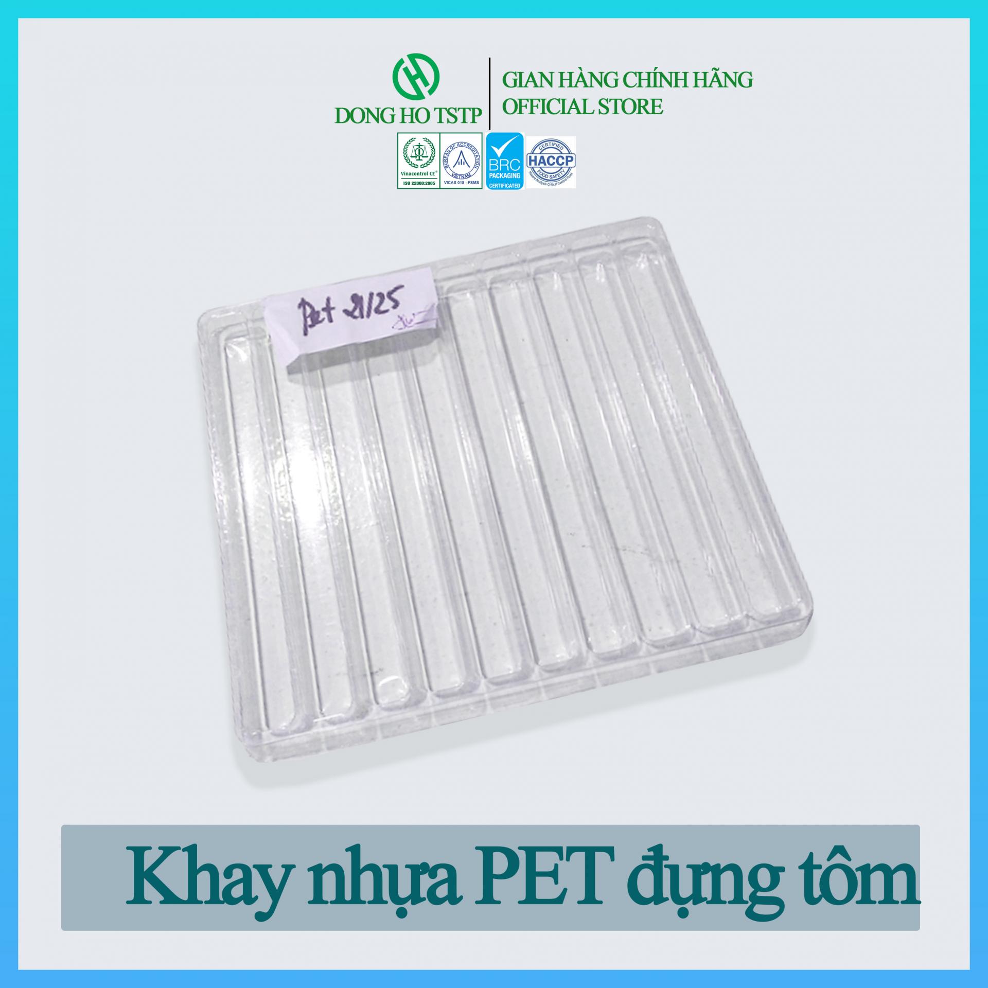 Đặc điểm sản phẩm: Khay nhựa PET đựng tôm được chia ra thành từng ngăn riêng biệt (thường 10 ngăn) với kích thước vừa đủ để đảm bảo sao cho giữ được hình dáng và chất lượng của tôm trong quá trình bảo quản tủ đông trong siêu thị hay vận chuyển trên các phương tiện để xuất khẩu đường thủy hay đường hàng không. Đặc biệt khay PET đựng tôm Dong Ho TSTP chuyên sử dụng để đựng tôm lạnh, xuất khẩu sống hay còn gọi là tôm Nobashi, chiều dài tôm được kéo ra bởi quá trình cắt bụng và ép,…vì vậy kích thước tôm sẽ thẳng và dài ra so với kích thước ban đầu của nó. Khay PET chính là một thiết kế tối ưu đảm bảo việc giữ tôm đúng form tránh va chạm bể nát,...