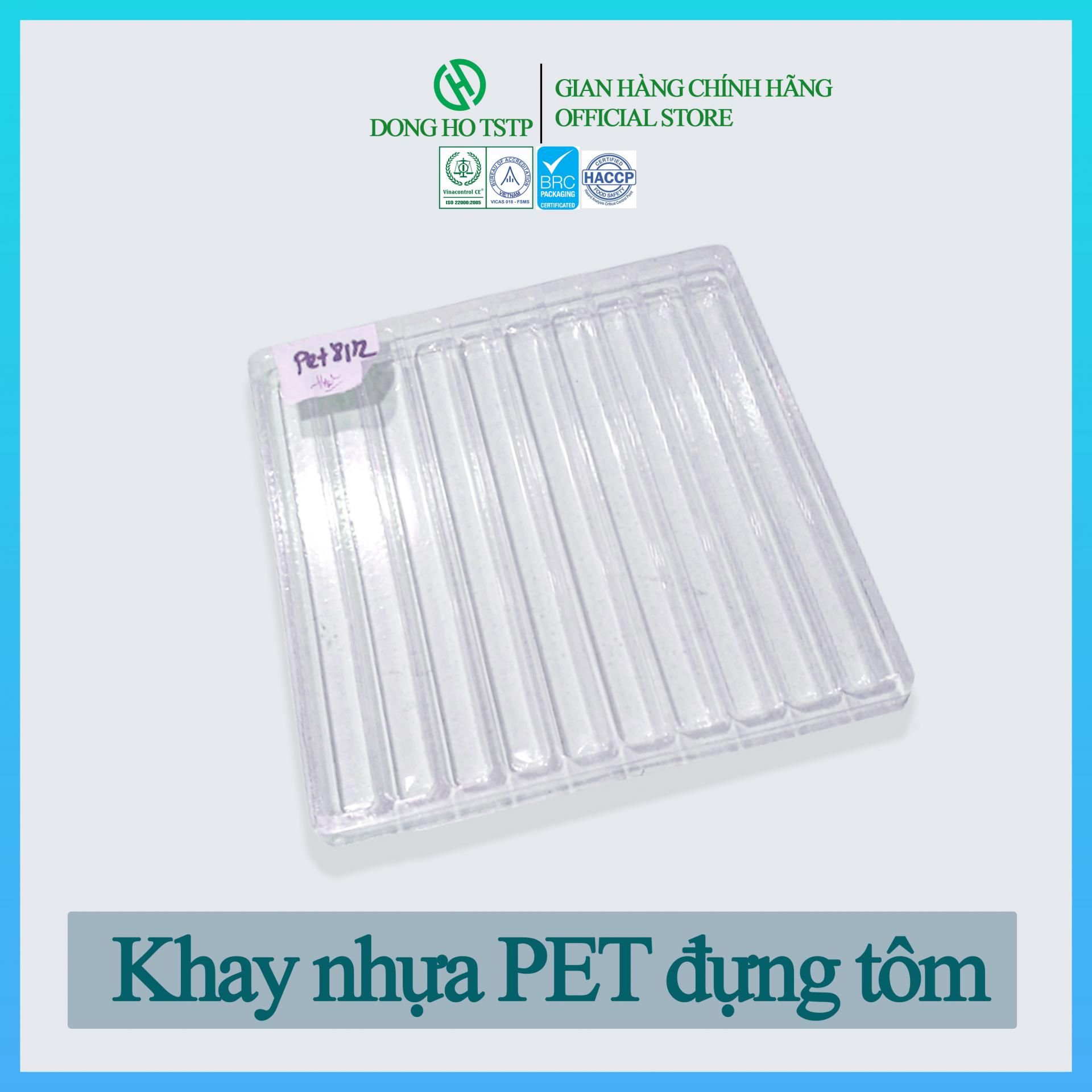 Đặc điểm sản phẩm: Khay nhựa PET đựng tôm được chia ra thành từng ngăn riêng biệt (thường 10 ngăn) với kích thước vừa đủ để đảm bảo sao cho giữ được hình dáng và chất lượng của tôm trong quá trình bảo quản tủ đông trong siêu thị hay vận chuyển trên các phương tiện để xuất khẩu đường thủy hay đường hàng không. Đặc biệt khay PET đựng tôm Dong Ho TSTP chuyên sử dụng để đựng tôm lạnh, xuất khẩu sống hay còn gọi là tôm Nobashi, chiều dài tôm được kéo ra bởi quá trình cắt bụng và ép,…vì vậy kích thước tôm sẽ thẳng và dài ra so với kích thước ban đầu của nó. Khay PET chính là một thiết kế tối ưu đảm bảo việc giữ tôm đúng form tránh va chạm bể nát,...